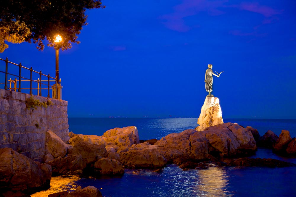 On the promontory in front of the one-time cemetery a girl of stone extend her arm to a gull. This, however, is a new sculpture, the work of a sculptor Car, and it was erected here in 1956 and turned into one of Opatija’s symbols. Before that, in its place, namely until demolished by a storm, stood the “Madonna del Mare”, the work of sculptor Rathausky from Graz (his also is the fountain “Helios and Selene” in the park between St. Jacob’s Church and hotel Imperial). The “Madonna” was erected to keep vigil over the soul of count Arthur Kesselstadt, who vanished, not far off from that promontory swallowed by the pre-Easter waves in 1891. During that excursion the contess Fries also lost her life, but her son Georg was saved.